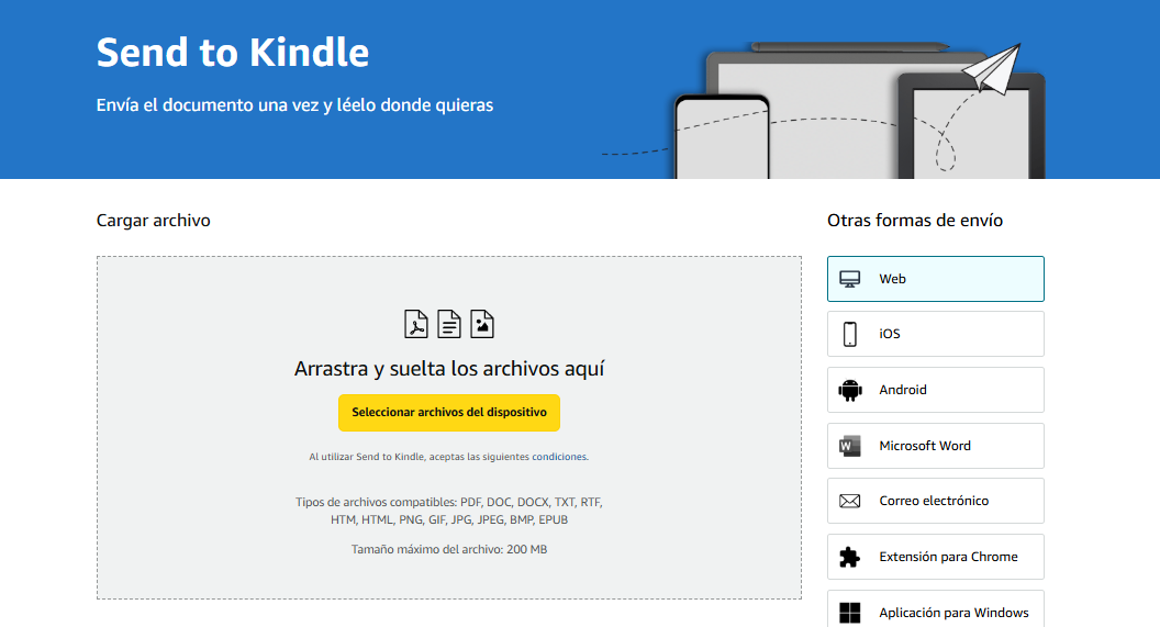 https://www.amazon.com/-/es/sendtokindle - Haz clic en la zona amarilla o arrastra tus archivos (PDF, EPUB, DOC…).